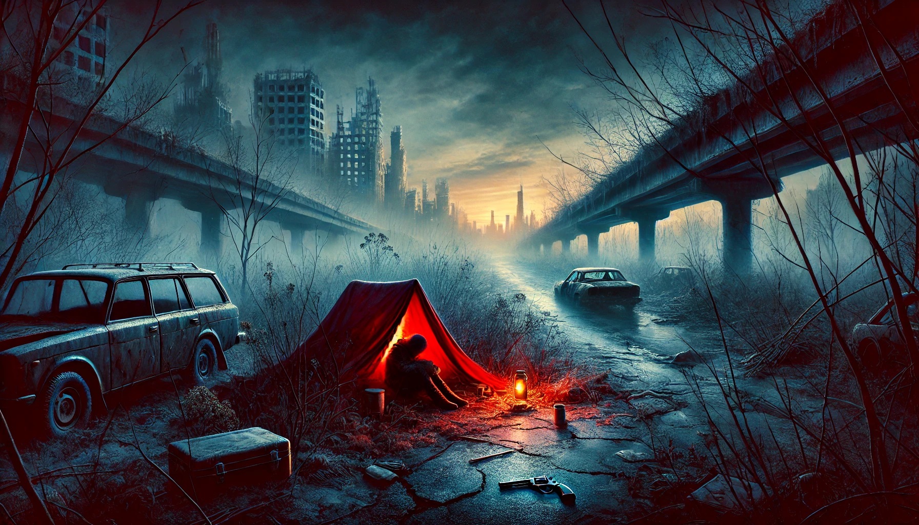 The path, the remains of a two-lane street, cluttered with old sedans and trucks covered with weeds and bush, makes a turn. There is no other way back to the barracks but forward, and as he makes the turn, he stops cold in his tracks. The path dips down, over the tops of rusted vehicles and shrubbery, beneath an overpass. Old rail tracks cross overhead. But it is the shadow under the pass he stares at. The voice he hears inside his head, an echo that emanates from those shadows, harkens to him: Let me in, it says.